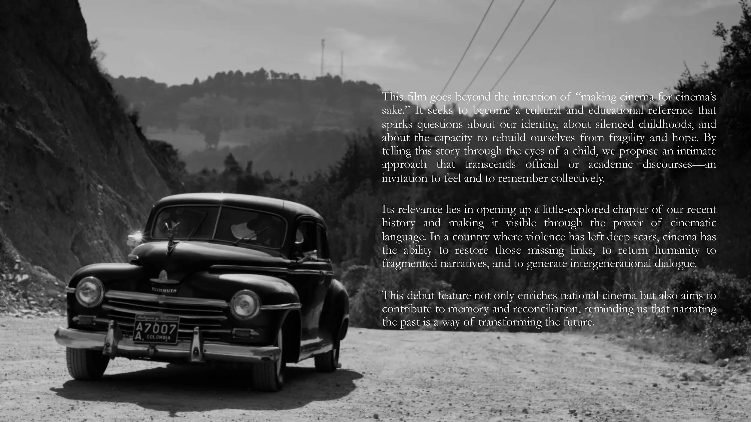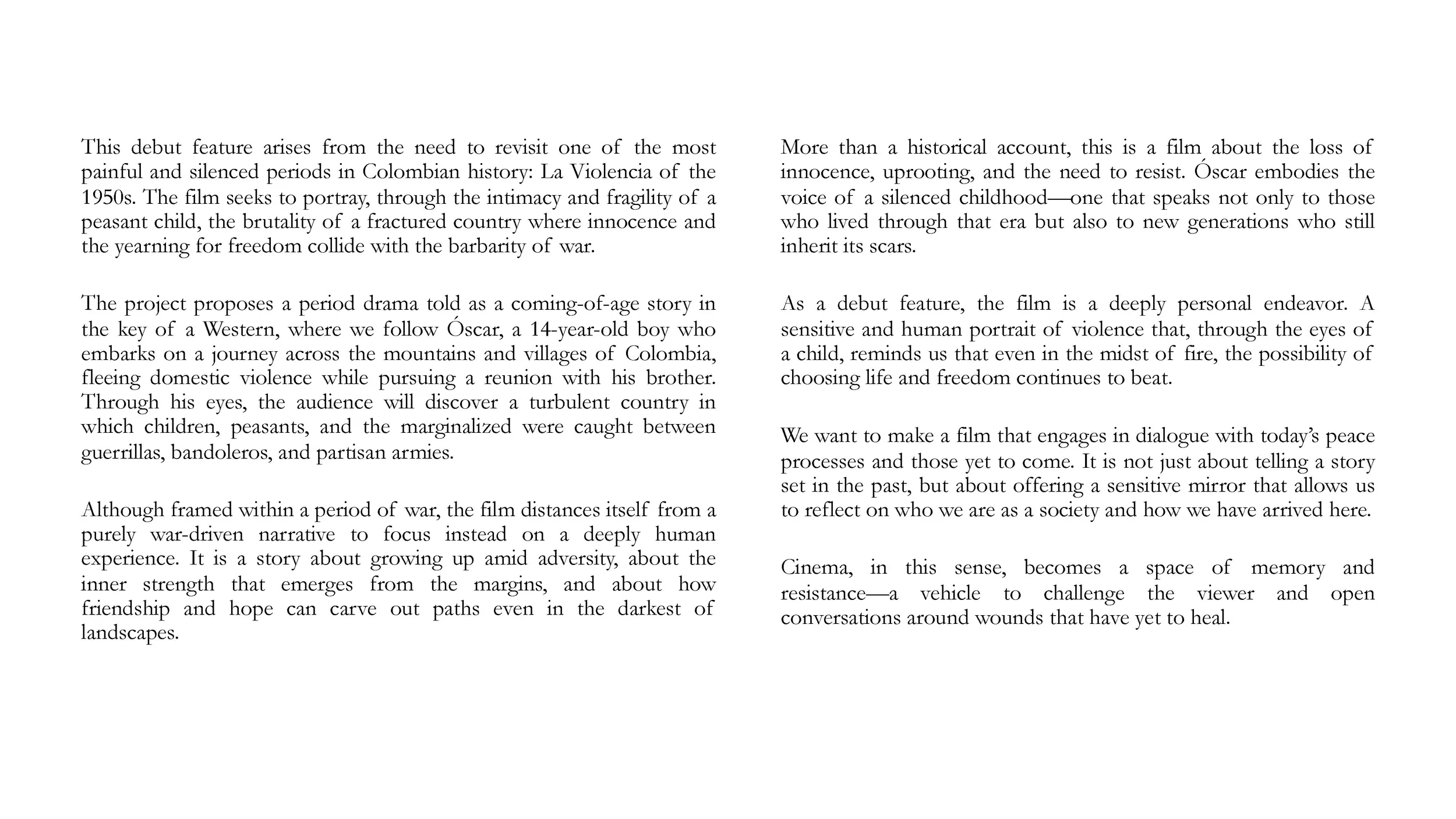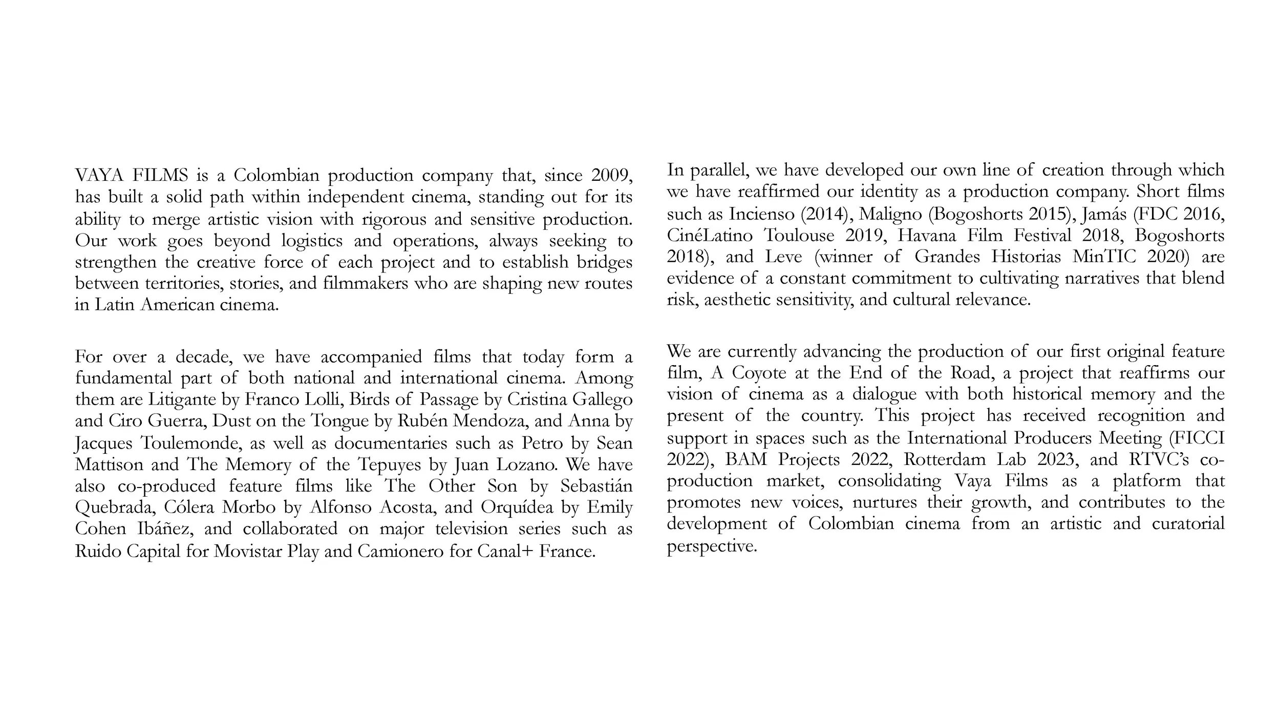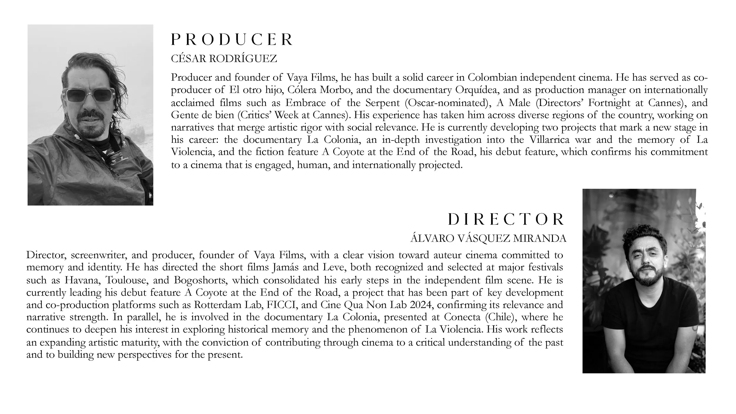 He is currently developing two projects that mark a new stage in his career: the documentary La Colonia, an in-depth investigation into the Villarrica war and the memory of La Violencia, and the fiction feature A Coyote at the End of the Road, his debut feature, which confirms his commitment to a cinema that is engaged, human, and internationally projected.