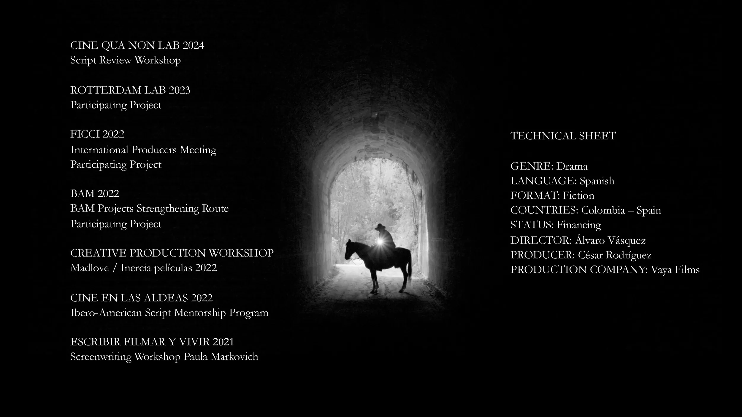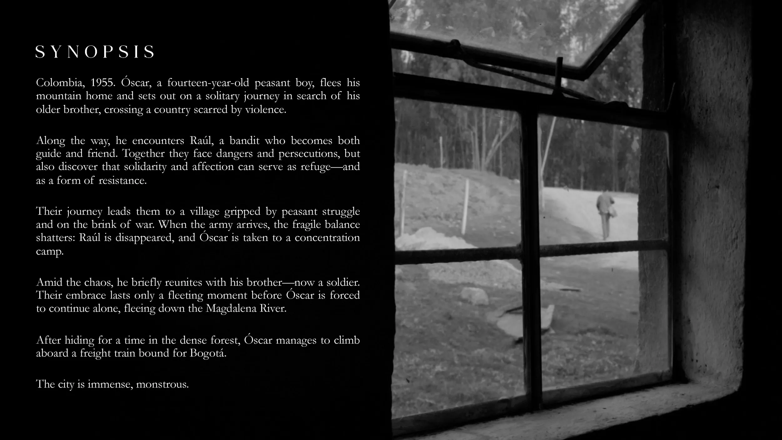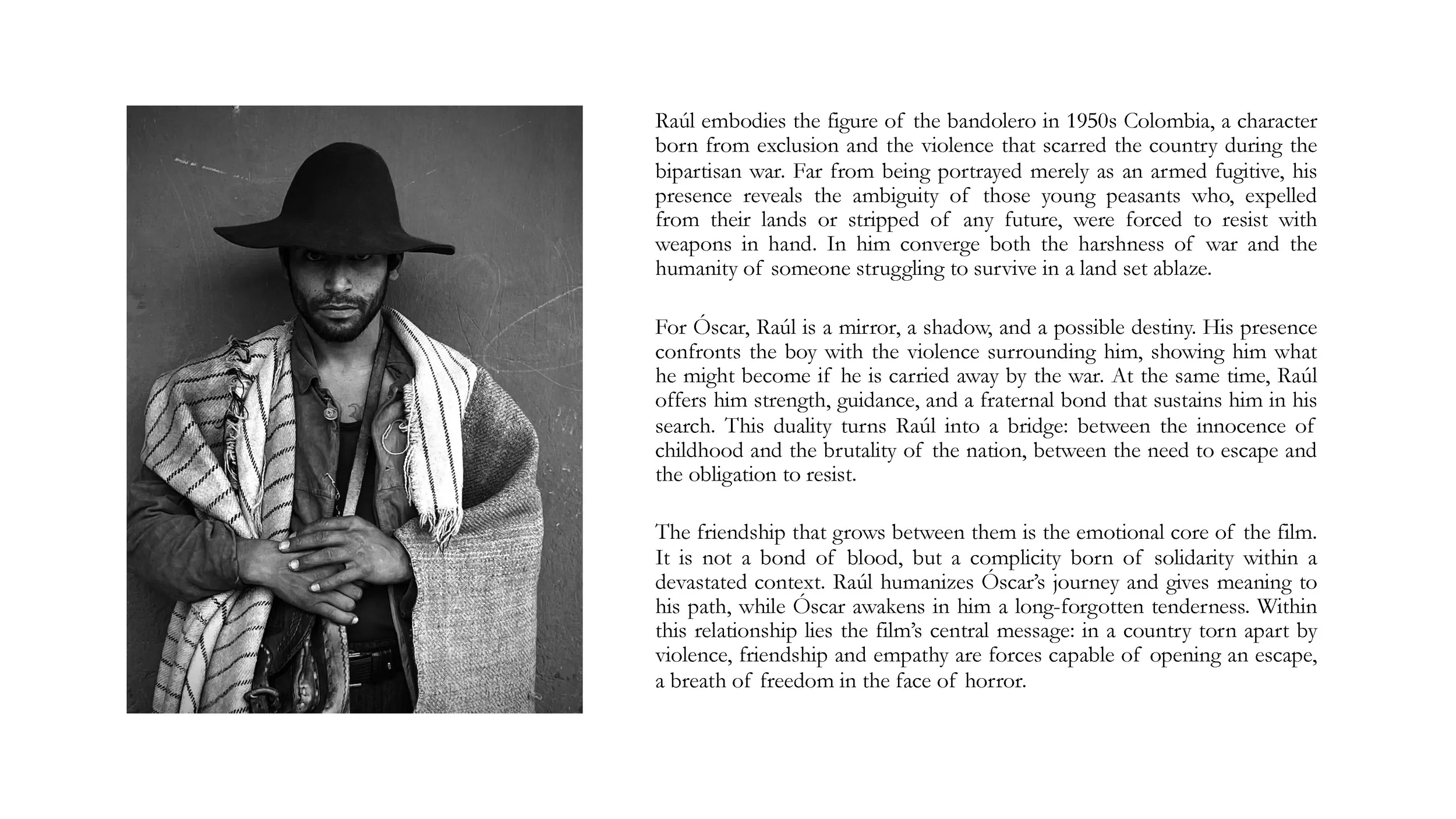 He is currently developing two projects that mark a new stage in his career: the documentary La Colonia, an in-depth investigation into the Villarrica war and the memory of La Violencia, and the fiction feature A Coyote at the End of the Road, his debut feature, which confirms his commitment to a cinema that is engaged, human, and internationally projected.