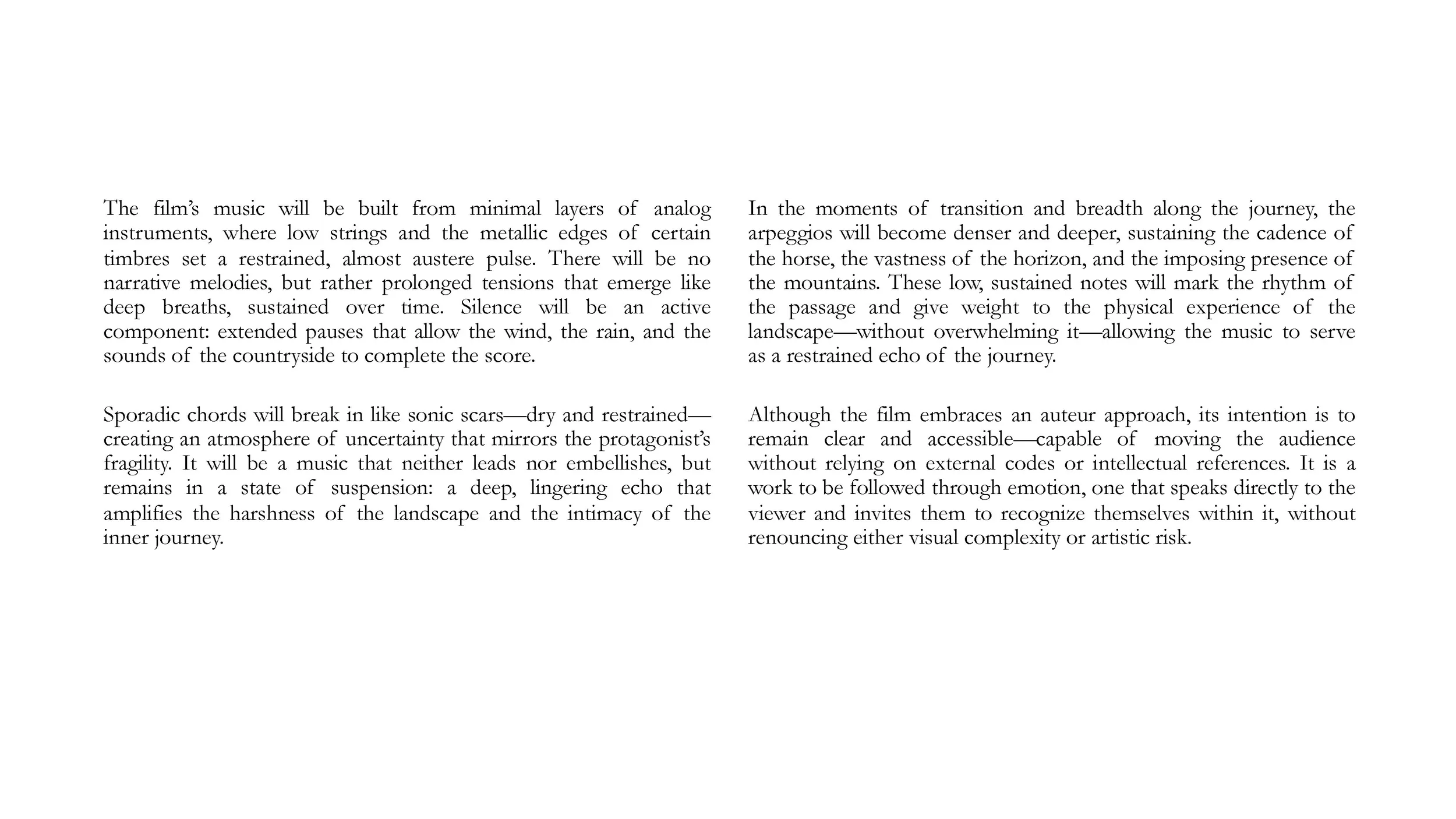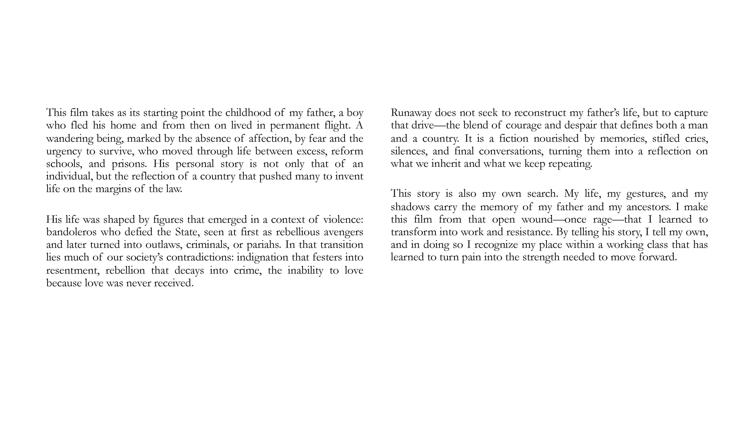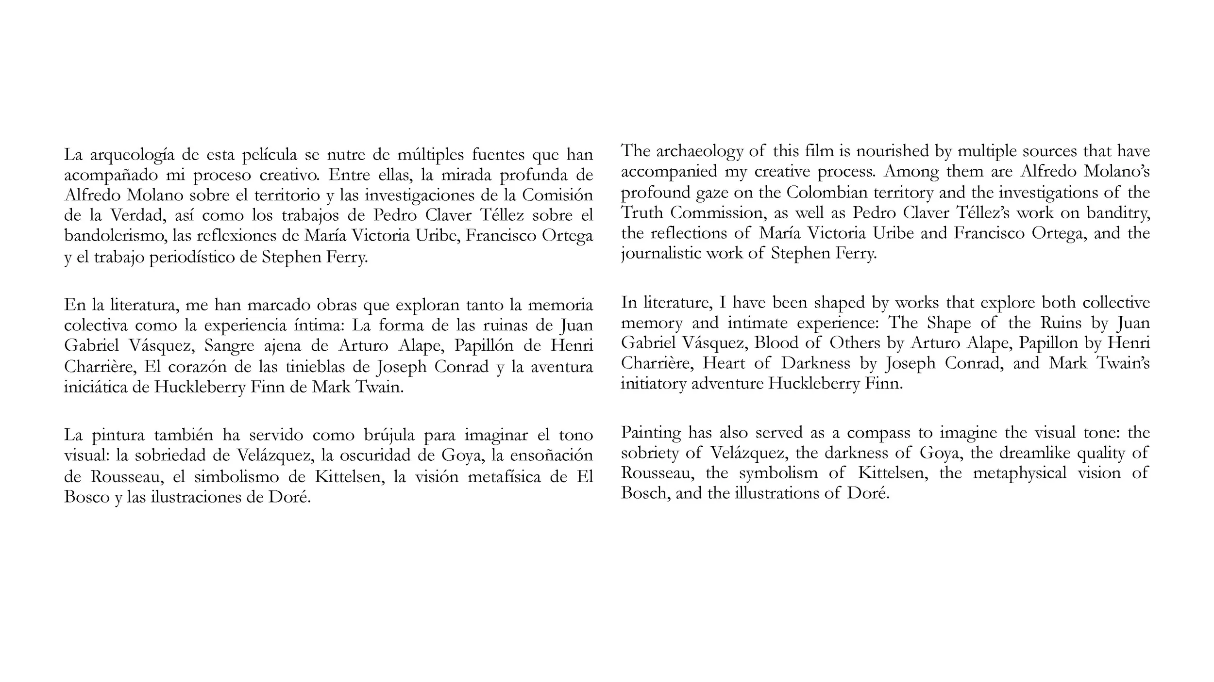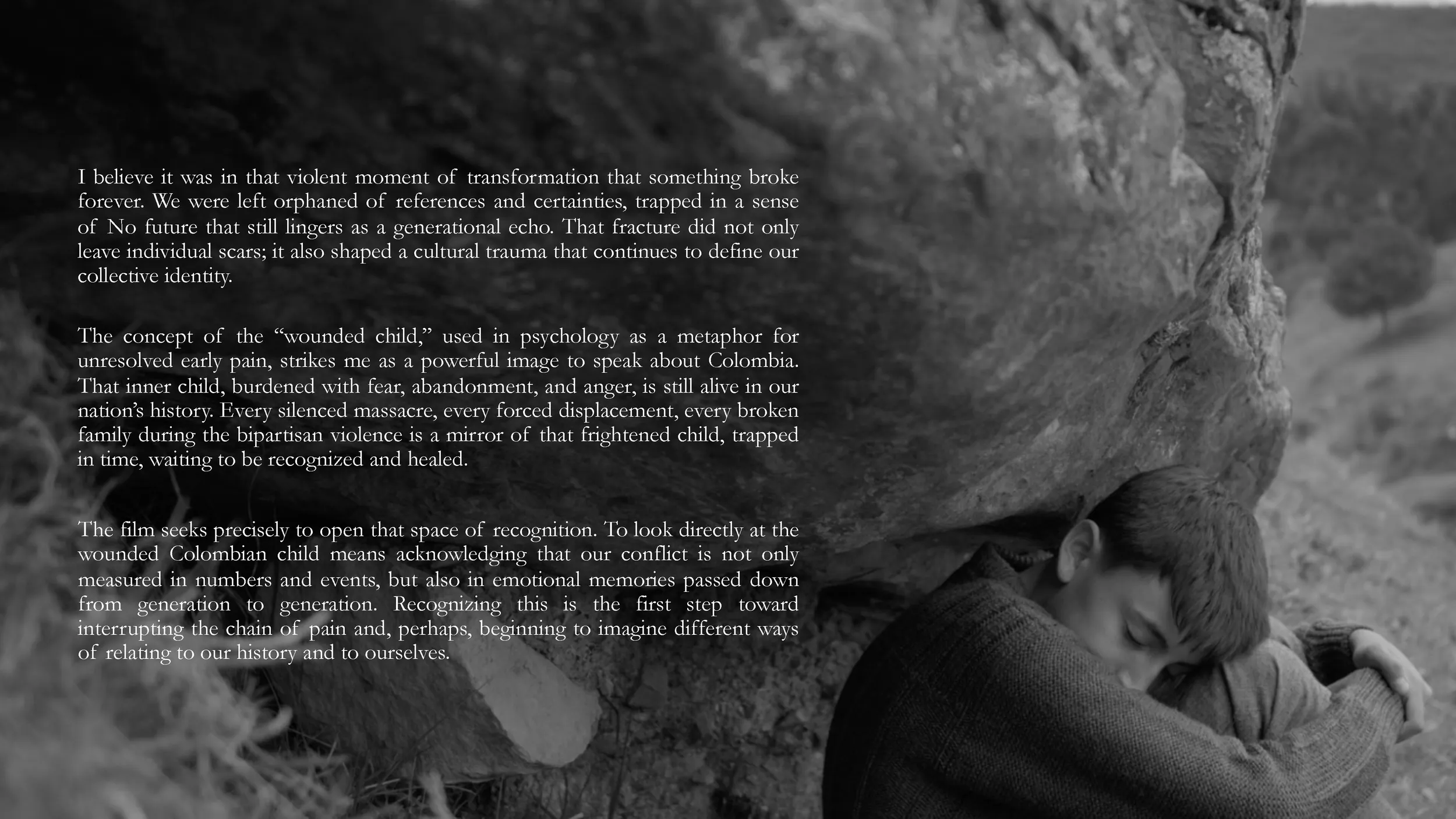 He is currently developing two projects that mark a new stage in his career: the documentary La Colonia, an in-depth investigation into the Villarrica war and the memory of La Violencia, and the fiction feature A Coyote at the End of the Road, his debut feature, which confirms his commitment to a cinema that is engaged, human, and internationally projected.