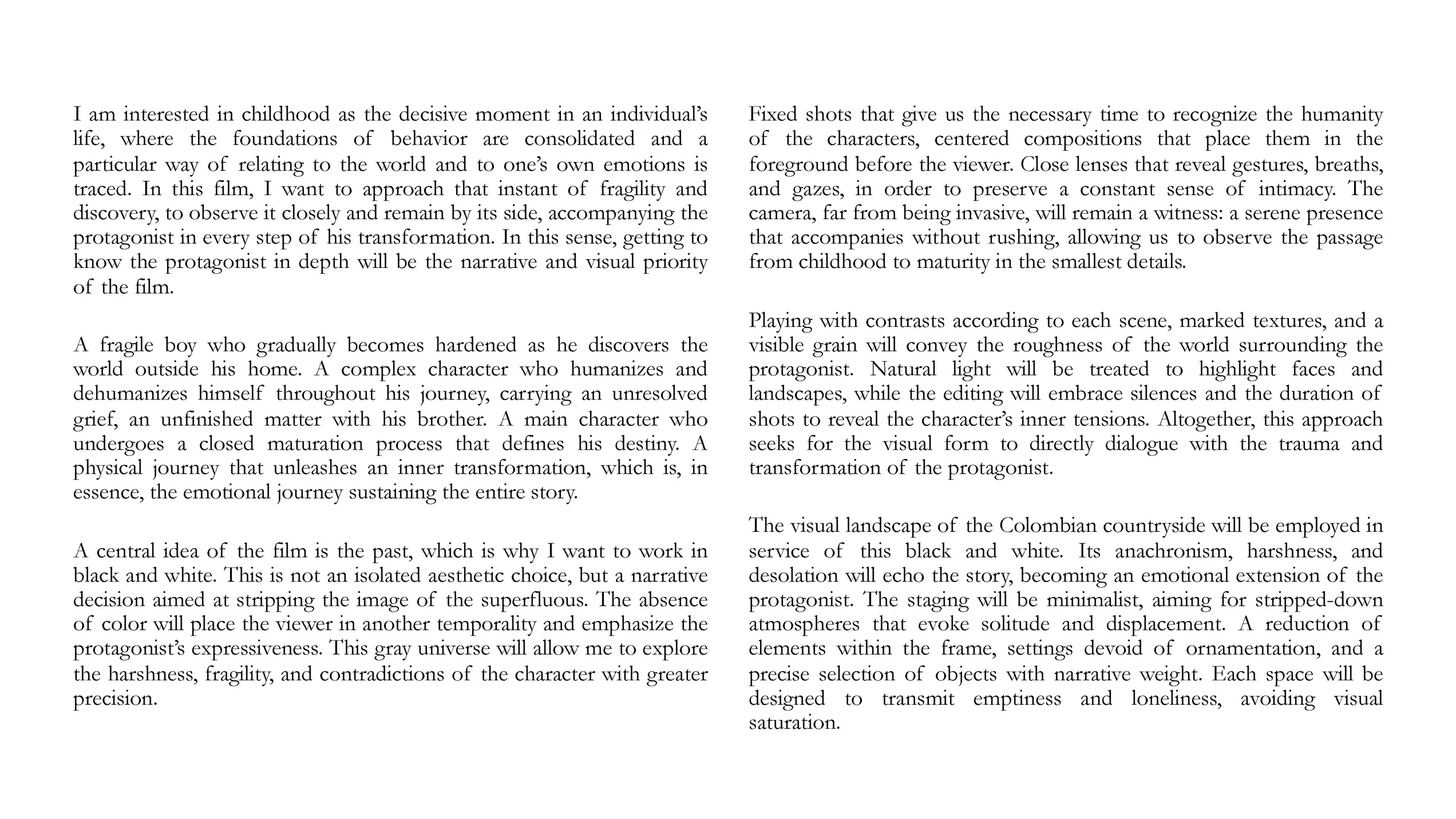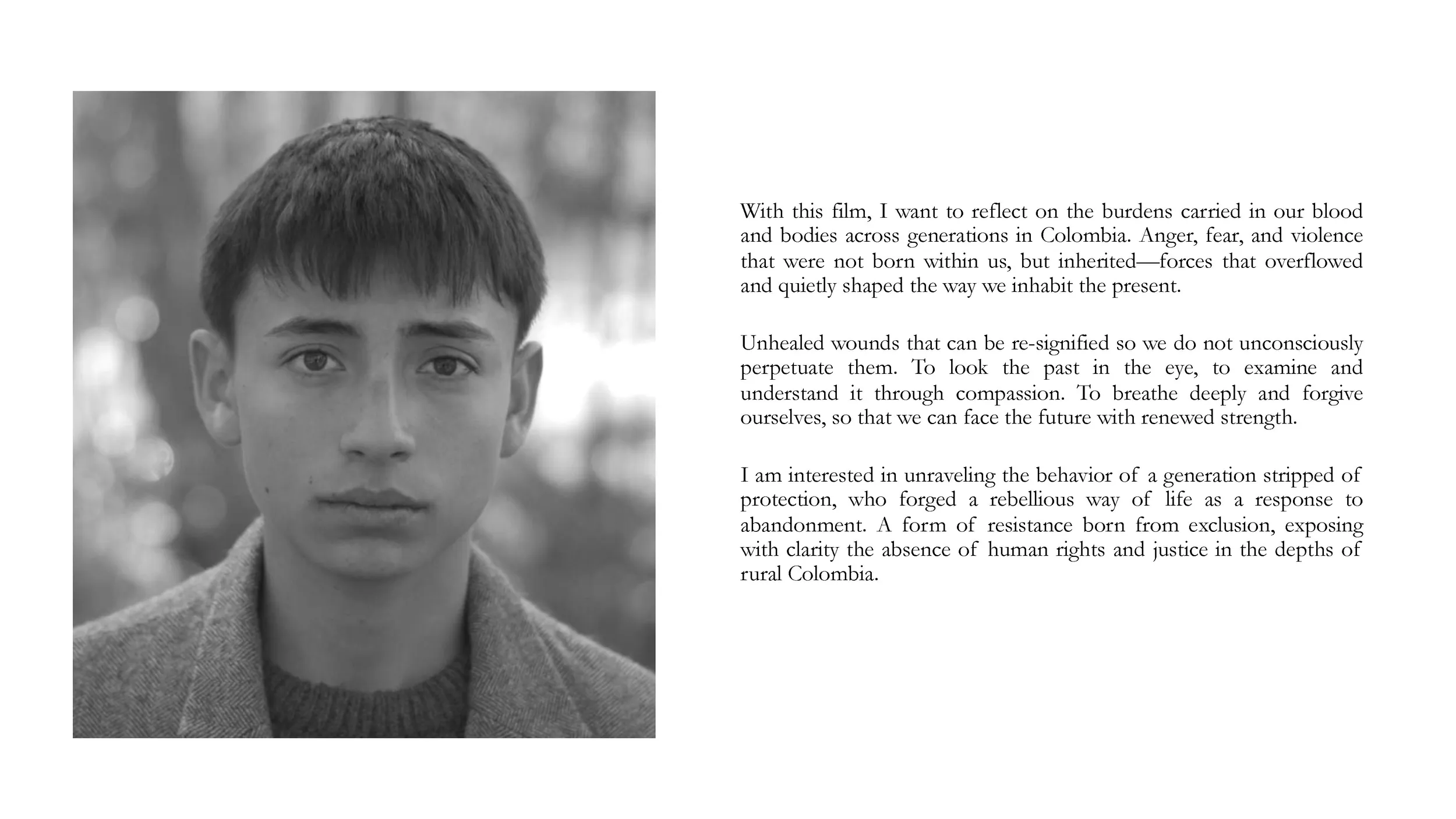 He is currently leading his debut feature A Coyote at the End of the Road, a project that has been part of key development and co-production platforms such as Rotterdam Lab, FICCI, and Cine Qua Non Lab 2024, confirming its relevance and narrative strength. In parallel, he is involved in the documentary La Colonia, presented at Conecta (Chile), where he continues to deepen his interest in exploring historical memory and the phenomenon of La Violencia. His work reflects an expanding artistic maturity, with the conviction of contributing through cinema to a critical understanding of the past and to building new perspectives for the present.